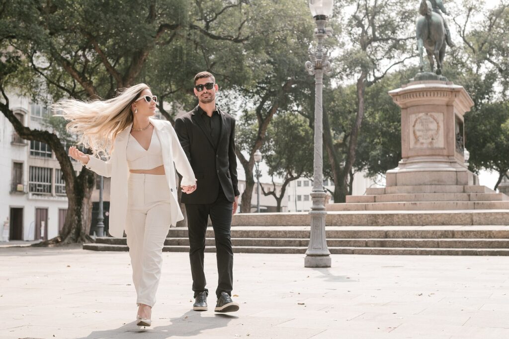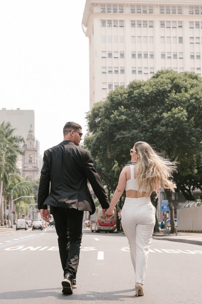 Entre olhares, sorrisos e passos pelas ruas da cidade, o ensaio é uma verdadeira declaração de amor — não só entre os noivos, mas também ao Rio.