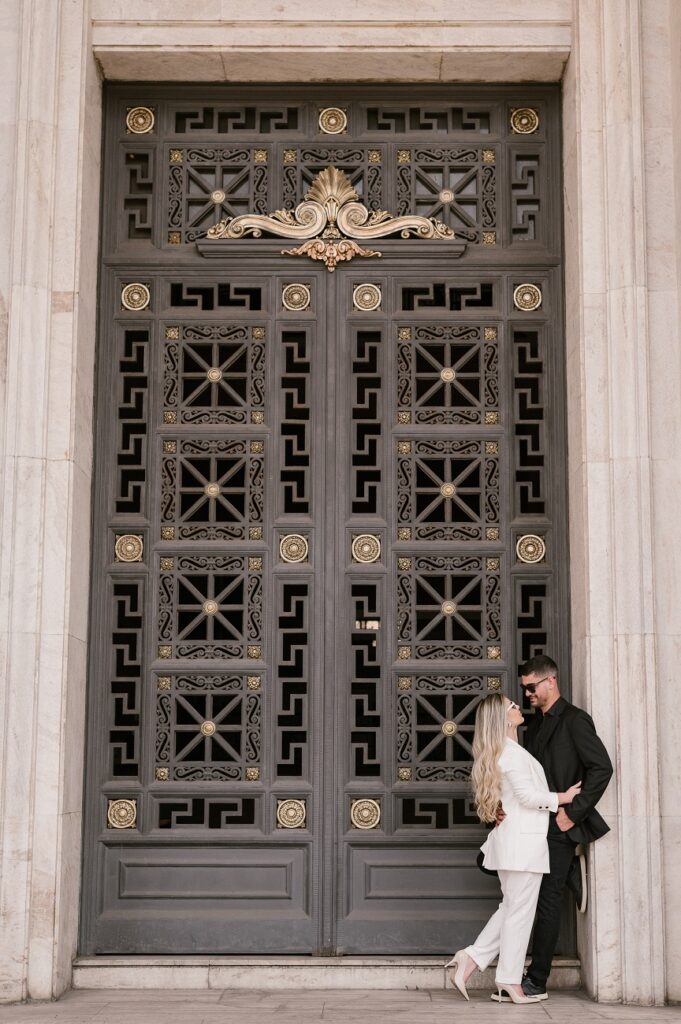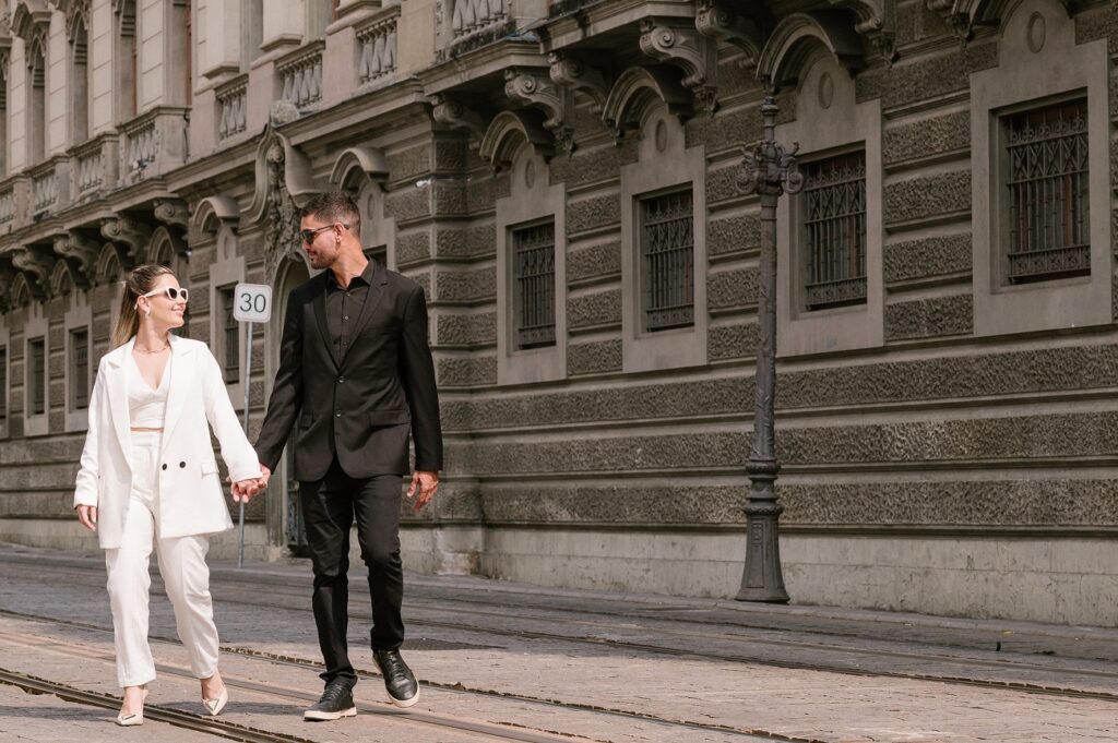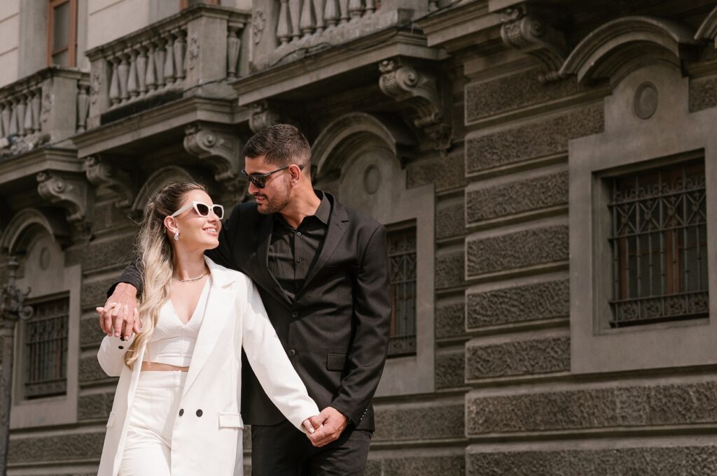 O centro da cidade, com sua mistura de arquitetura antiga, esquinas movimentadas, foi o pano de fundo perfeito para traduzir a essência moderna e autêntica dos noivos. Entre os prédios históricos, os becos charmosos e a atmosfera vibrante, o ensaio trouxe à tona o contraste perfeito entre o amor leve e o cenário urbano.